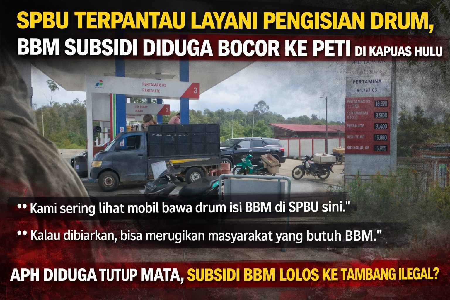 “Kami sering lihat mobil bawa drum isi BBM di sini. Kalau dibiarkan, bisa merugikan masyarakat yang butuh BBM,” ungkap seorang warga yang enggan disebutkan namanya.